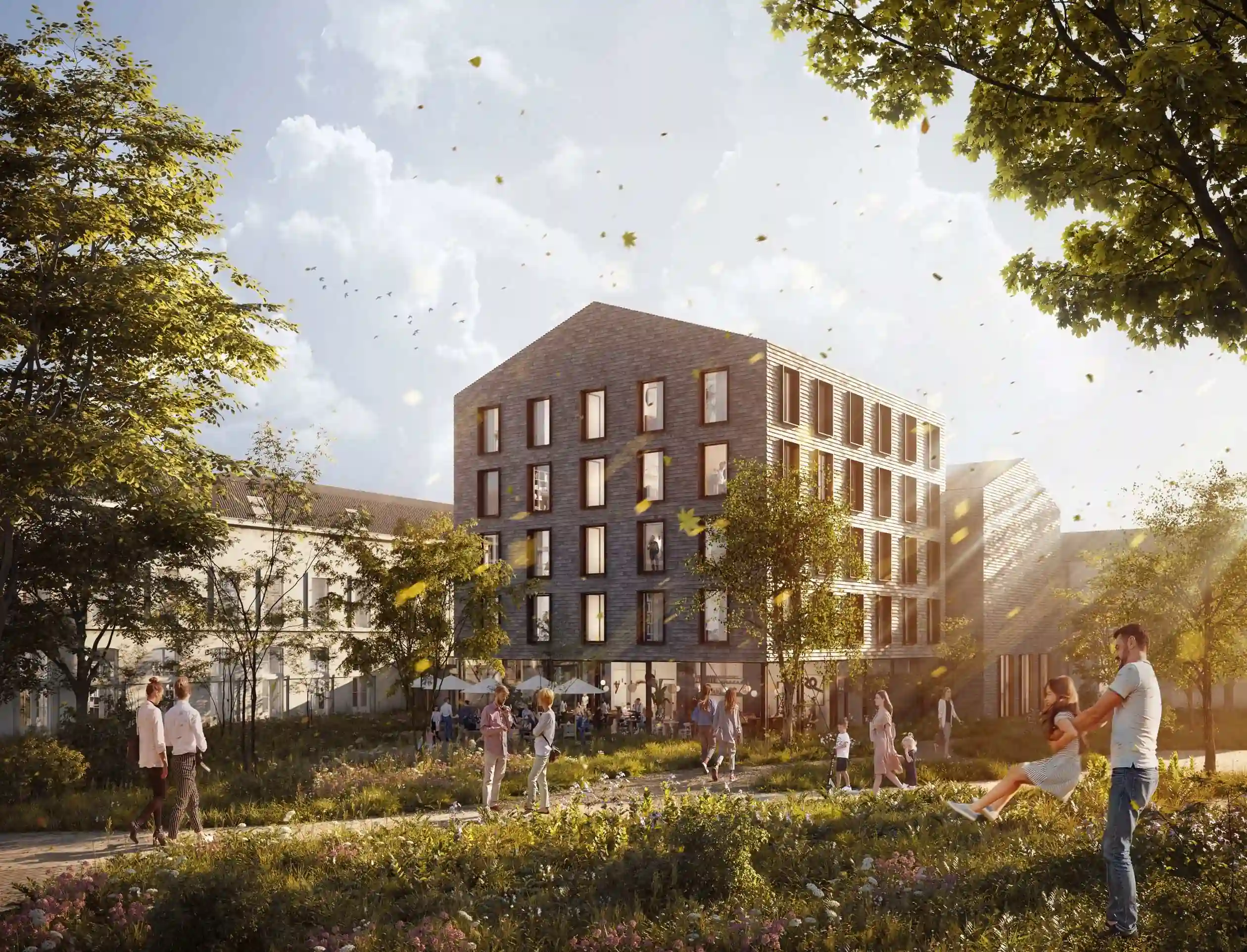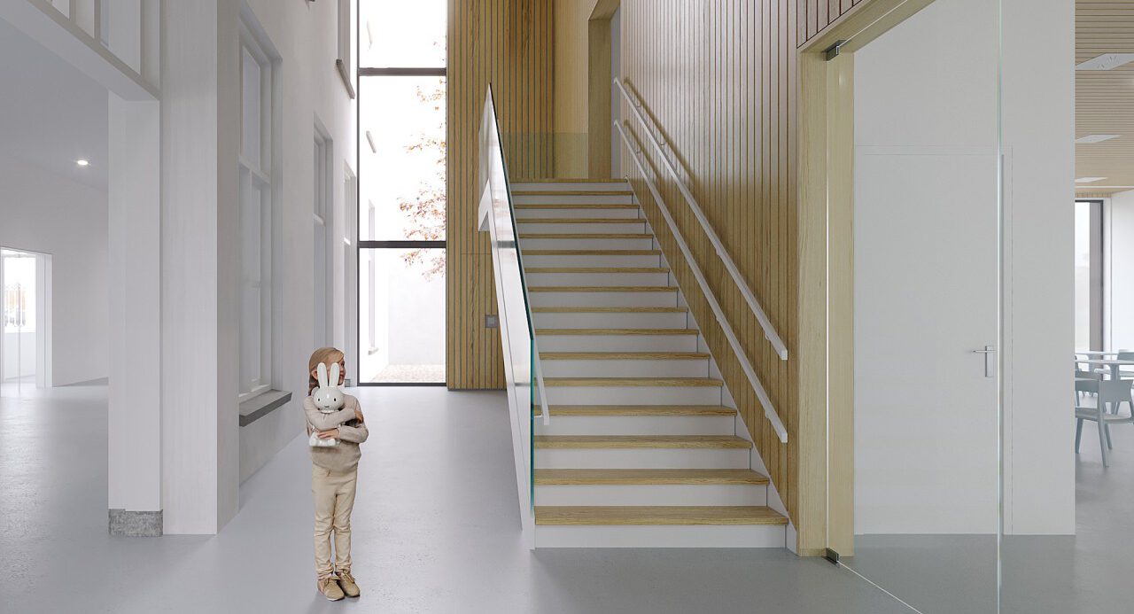 Lichtinval en transparantie zijn in het ontwerp nadrukkelijk ingezet: ramen, vides en open verbindingen zorgen voor een vriendelijke, lichte sfeer, terwijl het daglicht het interieur verrijkt zonder te storend te worden. Materialen als hout en keramiek dragen bij aan een warme, tactiele beleving, passend bij de jonge doelgroep.
