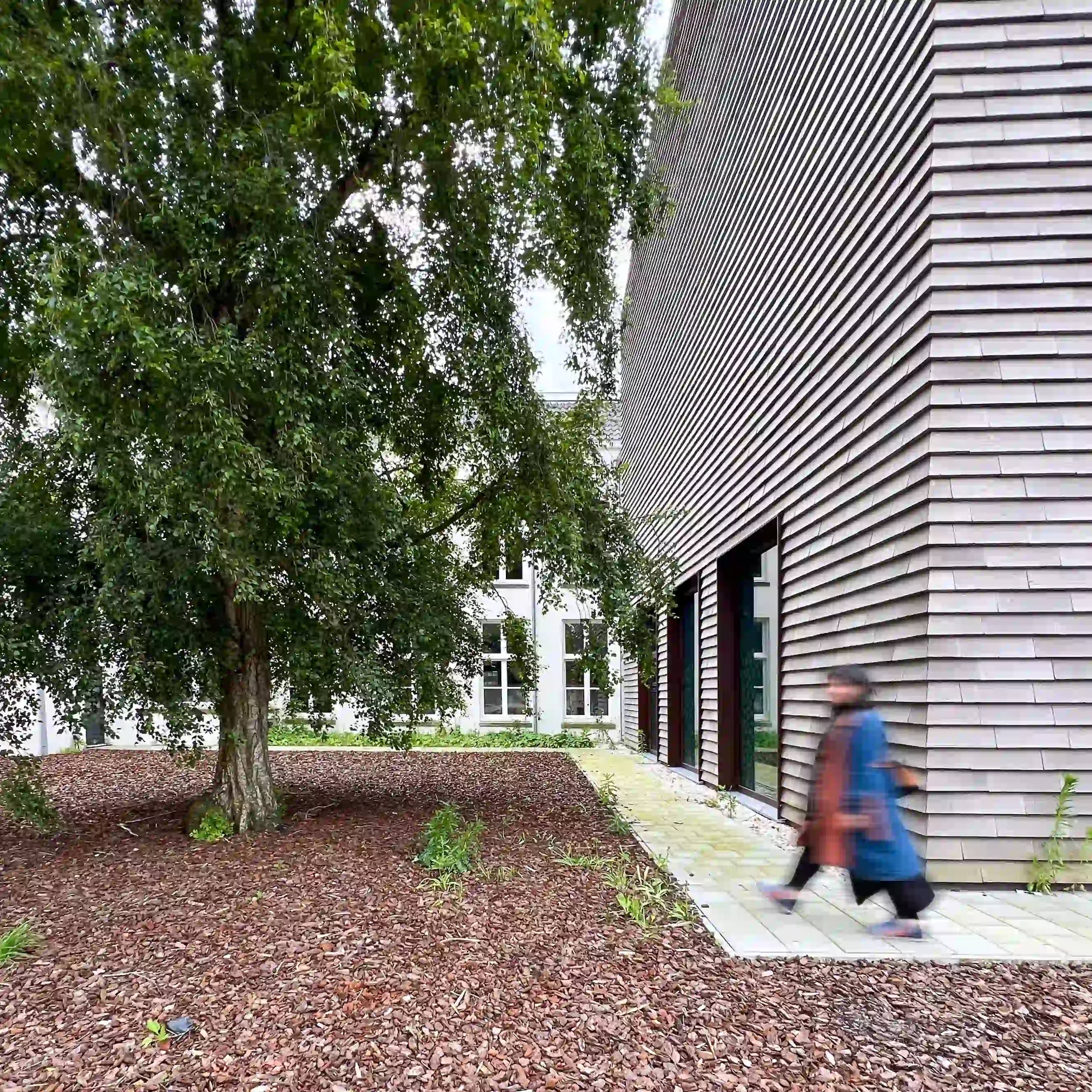 De uitbreiding is ontworpen als een zelfstandig volume dat losstaat van de bestaande bouw en verbonden is via een transparante corridor. Materialen en technieken zijn gekozen met oog voor duurzaamheid en flexibiliteit: keramische gevelpannen, hout, aluminium en andere demontabele componenten maken het gebouw modulair en toekomstbestendig.